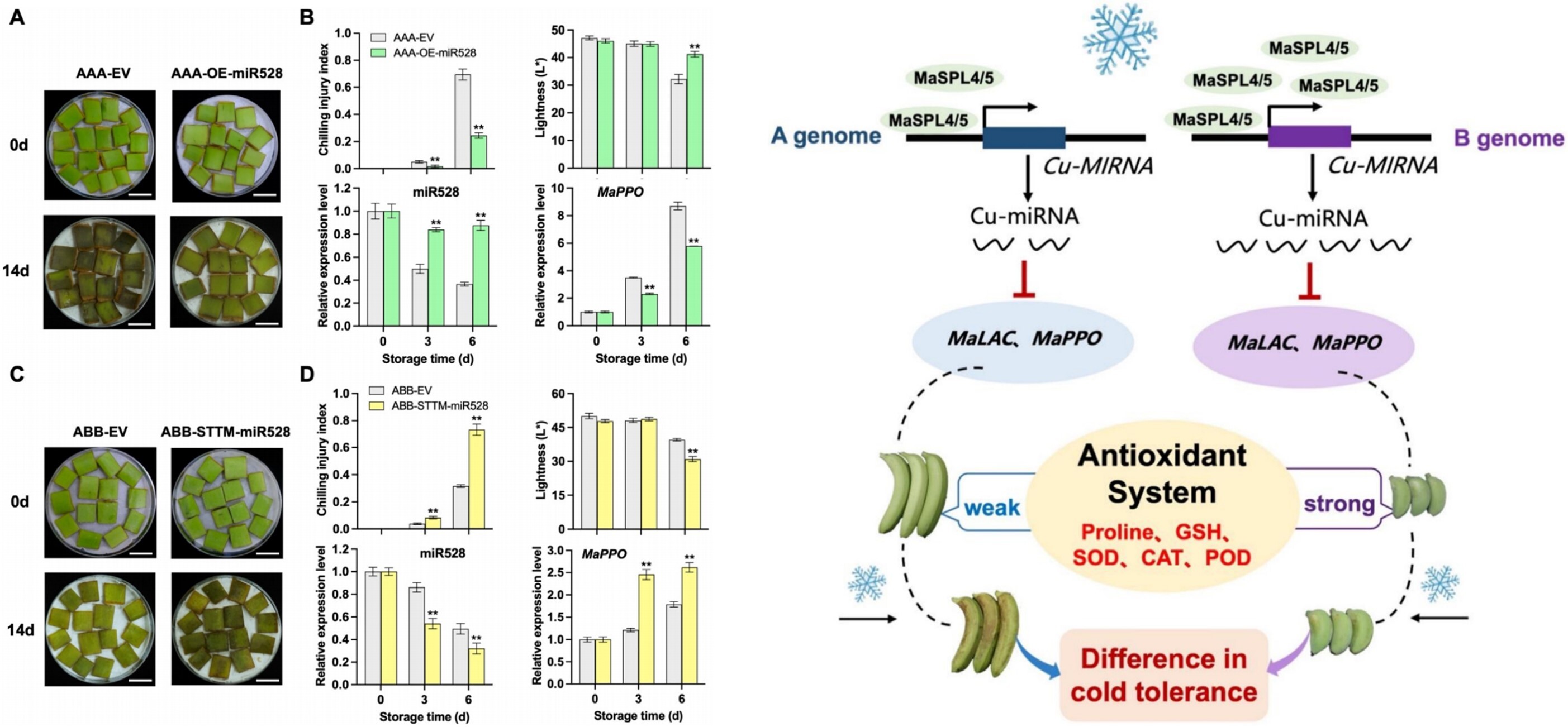 2026-03-23Decode Cold Tolerance Difference Mechanism in Banana - Fruit from A Large Herbal PlantThis study explored the molecular mechanism by which Cu-miRNA regulates the difference in cold tolerance between AAA type (Cavendish) and ABB type (Pisang Awak) banana fruits. It was confirmed that the differential expression of MaSPL4/5 were the key factor determining the differential accumulation of Cu-miRNA in these two types of banana fruits... Chinese researchers have uncovered the molecular mechanism underlying the cold tolerance difference in banana, fruit from a large herbal plant that could play a role in global food security.The study, conducted by researchers at the South China Botanical Garden under the Chinese Academy of Sciences and collaborators, was recently published in Jo...Read More