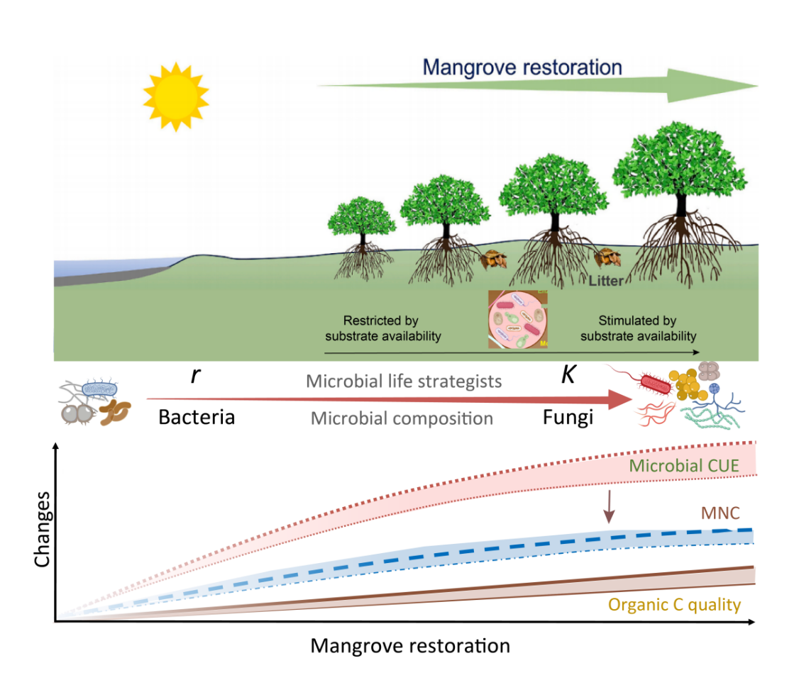 Figure. Mangrove restoration regulates soil microbial carbon use efficiency and necromass carbon formation.(Image by WANG et al.)